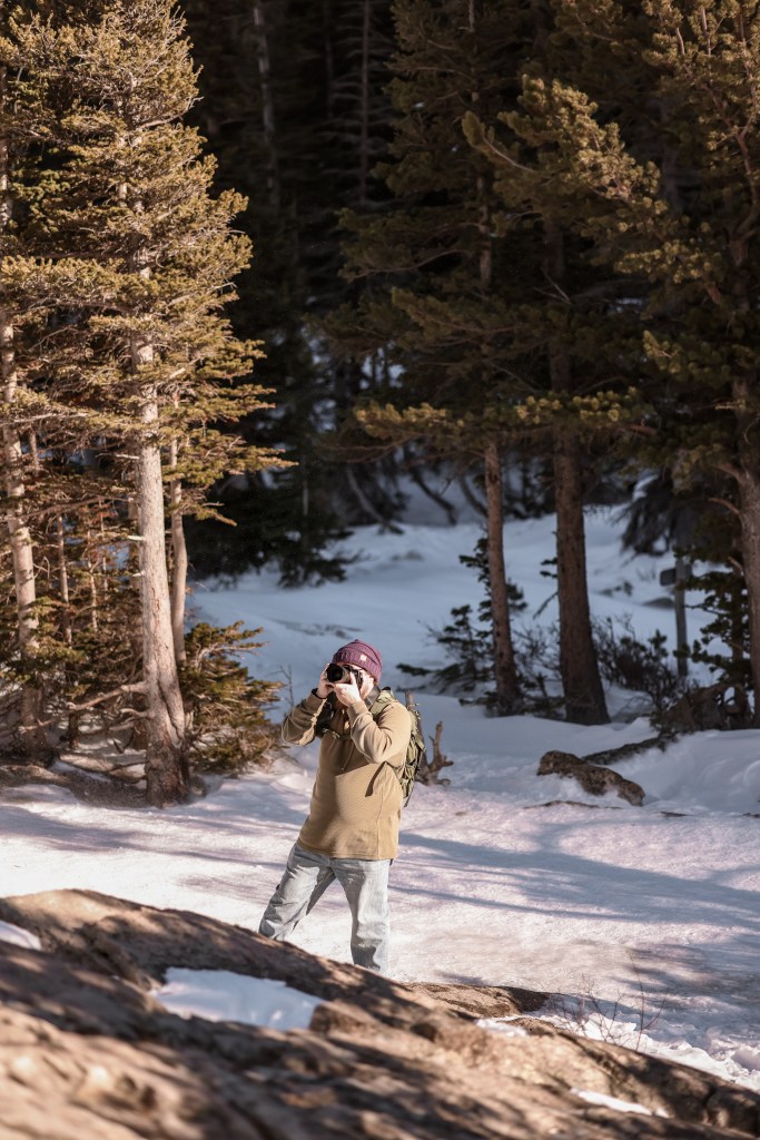 During another winter trip to Rocky Mountain National Park, I captured a moment that feels extraordinary. While on a nature walk, I noticed a new friend pausing to take a photo as golden hour light wrapped around him, giving him an ethereal glow. The snow on the ground reflected the soft, warm light, creating a dreamy, almost surreal atmosphere. There’s something so still and beautiful about this shot, the quiet of the mountain evening, the way the light cascades across the scene, and the peace that surrounds it all.